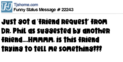 X just got a 'friend request' from Dr. Phil as suggested by another friend....Hmmmm, is this friend trying to tell me something???