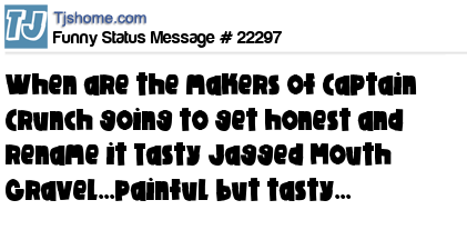 X says When are the makers of Captain Crunch going to get honest and rename it Tasty Jagged Mouth Gravel...painful but tasty...