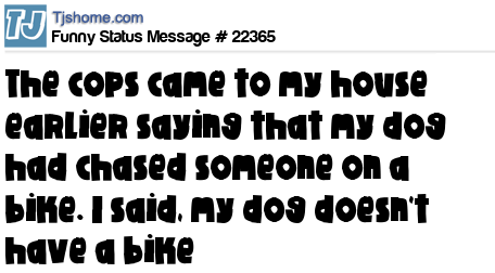 - # 17876 The cops came to my house earlier, claiming that my dog had chased someone on a bike. I said "Piss off, my dog doesn't have a bike!"