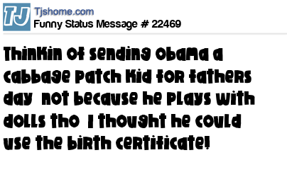 X is thinkin of sending obama a cabbage patch kid for fathers day not because he plays with dolls tho I thought he could use the birth certificate!
