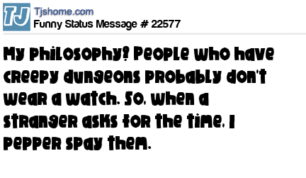 X My philosophy? People who have creepy dungeons probably don't wear a watch. So, when a stranger asks for the time, I pepper spay them.