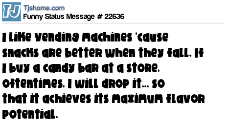 - # 3767 I like vending machines, because snacks are better when they fall. If I buy candy at the store, I'll drop it so that is achieves its maximum flavor potential.