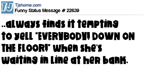 X ..always finds it tempting to yell "EVERYBODY! DOWN ON THE FLOOR!" when she's waiting in line at her bank.