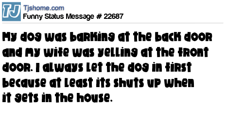 X My dog was barking at the back door and my wife was yelling at the front door. I always let the dog in first because at least its shuts up when it gets in the house.