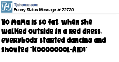 X Yo mama is so fat, when she walked outside in a red dress, everybody started dancing and shouted "KOOOOOOOL-AID!"