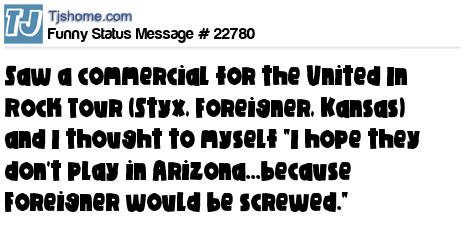 X  saw a commercial for the United In Rock Tour (Styx, Foreigner, Kansas) and I thought to myself "I hope they don't play in Arizona...because Foreigner would be screwed."