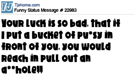X is Your luck is so bad, that if I put a bucket of pu*sy in front of you, you would reach in pull out an a**hole!!