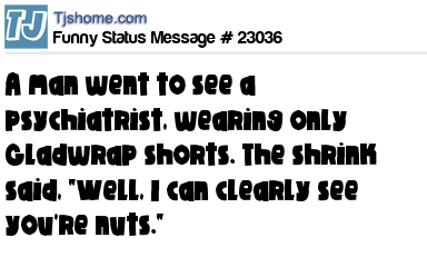 - # 27454 ~ A man went to see a psychiatrist, wearing only Gladwrap shorts. The shrink said, "Well, I can clearly see you're nuts".