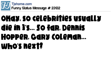 X Okay, so celebrities usually die in 3's... So far, Dennis Hopper, Gary Coleman... who's next?