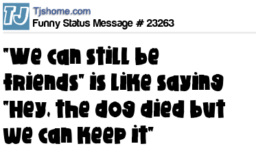 - # 164340 Saying "we can still be friends" is like your mom telling you that your dog died and saying "you can still keep it."