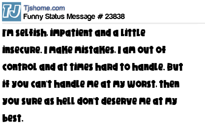 X says I'm selfish, impatient and a little insecure. I make mistakes, I am out of control and at times hard to handle. But if you can't handle me at my worst, then you sure as hell don't deserve me at my best.