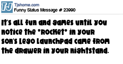 X says It's all fun and games until you notice the *rocket* in your son's Lego launchpad came from the drawer in your nightstand.