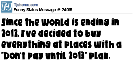 - # 54747 Since the damn world is ending in 2012, I've decided to buy everything at places with a "Don't pay until 2013" plan.