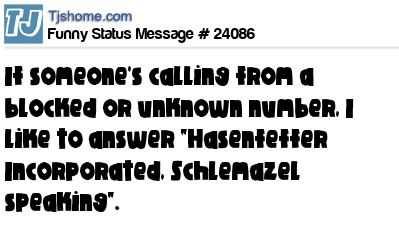 X If someone's calling from a blocked or unknown number, I like to answer "Hasenfeffer Incorporated, Schlemazel speaking".