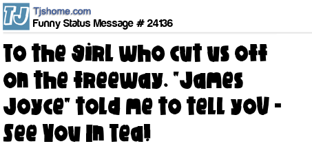 X is To the girl who cut us off on the freeway. "James Joyce" told me to tell yoU - See You In Tea!