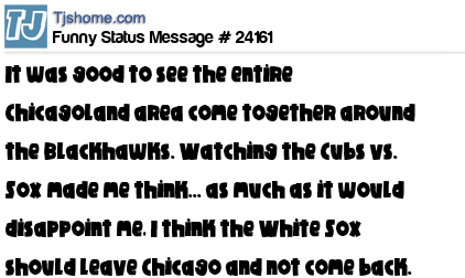 X It was good to see the entire Chicagoland area come together around the Blackhawks. Watching the Cubs vs. Sox made me think... as much as it would disappoint me, I think the White Sox should leave Chicago and not come back. Its for unification.