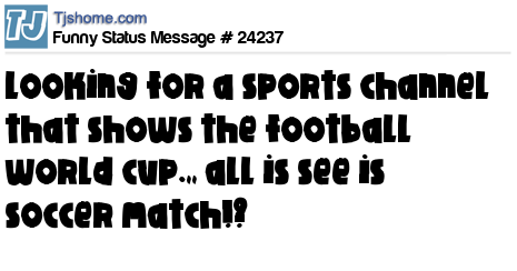 - # 187509 Yay! Now I can go back to saying the word "Soccer" without some pretentious fan reminding me that it's referred to as "Football" in other parts of the world.