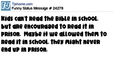 - # 179015 I don't get it. The Bible is not allowed in public schools but is encouraged in prisons. Maybe if we allowed the Bible in schools there would be less people in prison. Ever think of that?