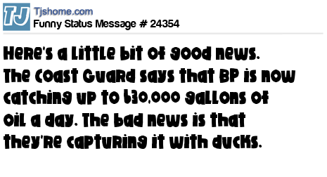 X says Here's a little bit of good news. The Coast Guard says that BP is now catching up to 630,000 gallons of oil a day. The bad news is that they're capturing it with ducks.