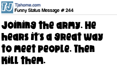 This was not funny. Many people don't come home from the army, and some cokme home messed up. Next time you wanty to say something you should think before you speak. KBye.