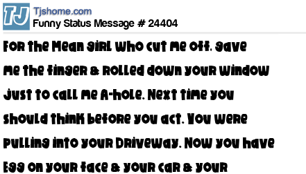 X For the Mean girl who cut me off, gave me the finger & rolled down your window just to call me A-hole. Next time you should think before you act. You were pulling into your Driveway. Now you have Egg on your face & your car & your house. =)
