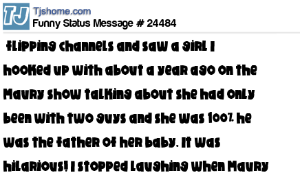 - # 14894 flipping channels and saw a girl I hooked up with about a year ago on the Maury show talking about she had only been with two guys and she was 100% he was the father of her baby. It was hilarious! I stopped laughing when Maury said you are not the father.