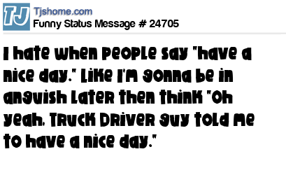 X I hate when people say "have a nice day." Like I'm gonna be in anguish later then think "Oh yeah, Truck Driver guy told me to have a nice day."