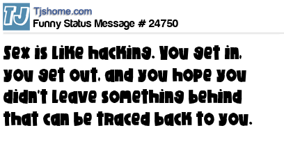 - # 83467 Hacking is like sex. You get in, you get out, and hope that you didn't leave something that can be traced back to you