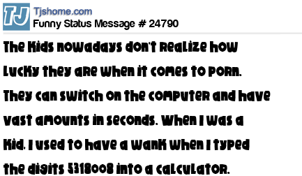 X The kids nowadays don't realize how lucky they are when it comes to porn. They can switch on the computer and have vast amounts in seconds. When I was a kid, I used to have a wank when I typed the digits 5318008 into a calculator.