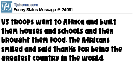 X is US troops went to Africa and built them houses and schools and then brought them food. The Africans smiled and said thanks for being the greatest country in the world.