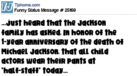 X ...just heard that the Jackson family has asked, In honor of the 1-year anniversary of the death of Michael Jackson, that all child actors wear their pants at "half-staff" today...