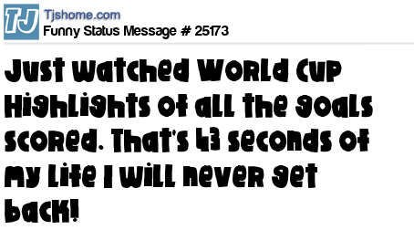 X has just watched World Cup Highlights of all the goals scored. That's 43 seconds of my life I will never get back!