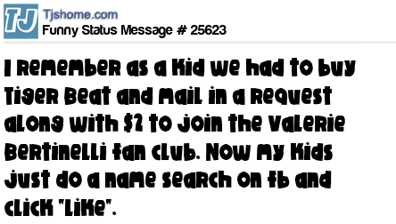 X  I remember as a kid we had to buy Tiger Beat and mail in a request along with $2 to join the Valerie Bertinelli fan club. Now my kids just do a name search on fb and click "like".