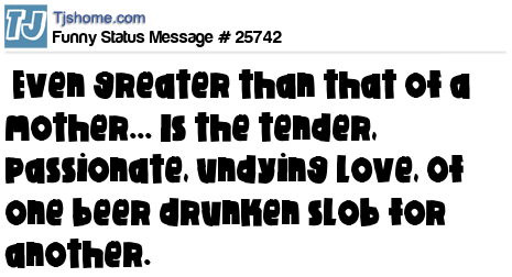 X Even greater than that of a mother... Is the tender, passionate, undying love, Of one beer drunken slob for another.”