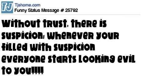 - # 25677 without trust, there is suspicion whenever your filled with suspicion everyone starts looking evil to you
