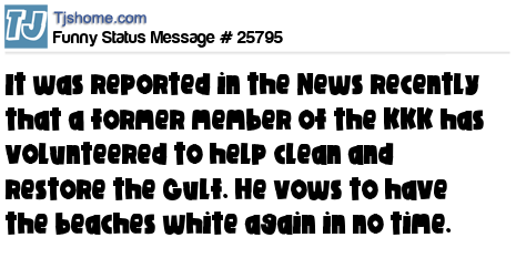 X It was reported in the News recently that a former member of the KKK has volunteered to help clean and restore the Gulf. He vows to have the beaches white again in no time.