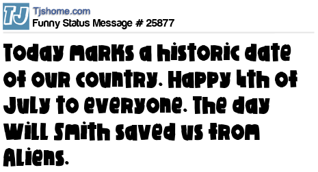 - # 105252 My american friends!! While you are enjoying your BBQ's, cookouts, and family get togethers! Please remember what this Independence Day truly represents! Today Will Smith AND Jeff Goldblum saved the population of earth from alien oppression by uploading a