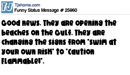 X says Good news. They are opening the beaches on the Gulf. They are changing the signs from "swim at your own risk" to "Caution Flammable!".
