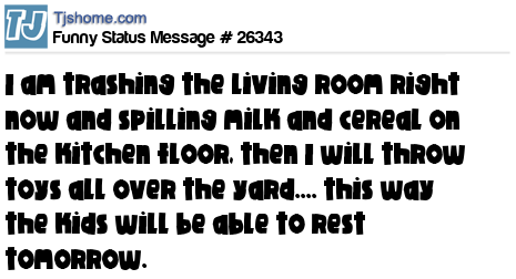 X says I am trashing the living room right now and spilling milk and cereal on the kitchen floor, then I will throw toys all over the yard.... this way the kids will be able to rest tomorrow.