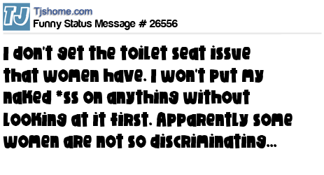 - # 63251 I don't get the toilet seat issue that woman have. I won't put my naked butt on anything without looking at it first. Apparently some woman ar not so discriminating