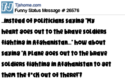X ..instead of politicians saying "My heart goes out to the brave soldiers fighting in Afghanistan..." how about saying "A plane goes out to the brave soldiers fighting in Afghanistan to get them the f*ck out of there!"?