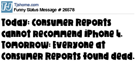 X Today: Consumer Reports cannot recommend iPhone 4. Tomorrow: Everyone at Consumer Reports found dead.