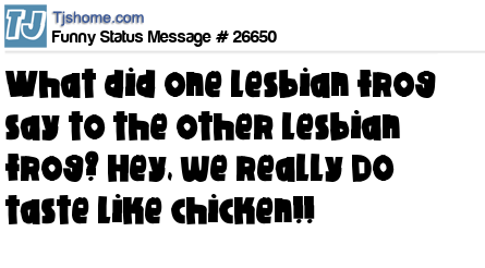 X is What did one lesbian frog say to the other lesbian frog? Hey, we really DO taste like chicken!!