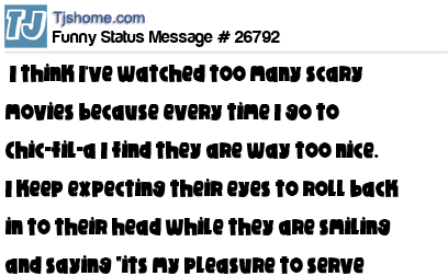 X is I think I've watched too many scary movies because every time I go to Chic-fil-a I find they are way too nice. I keep expecting their eyes to roll back in to their head while they are smiling and saying "its my pleasure to serve you."