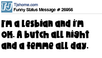 X I'm a lesbian and i'm ok. A butch all night and a femme all day.