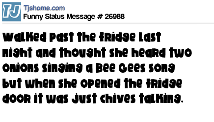 X walked past the fridge last night and thought she heard two onions singing a Bee Gees song but when she opened the fridge door it was just chives talking.