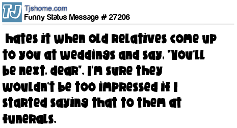 - # 27229 hates it when old relatives come up to you at weddings and say, "You'll be next, dear". I'm sure they wouldn't be too impressed if I started saying that to them at funerals.