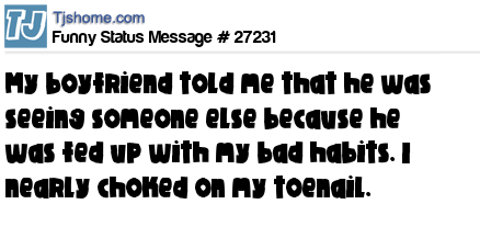 X My boyfriend told me that he was seeing someone else because he was fed up with my bad habits. I nearly choked on my toenail.