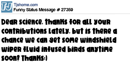 X dear science, thanks for all your contributions lately, but is there a chance we can get some windshield wiper fluid infused birds anytime soon? Thanks:)