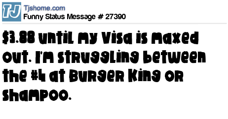 - # 52939 $3.88 until my Visa is maxed out. I'm struggling between the #4 at Burger King or shampoo...